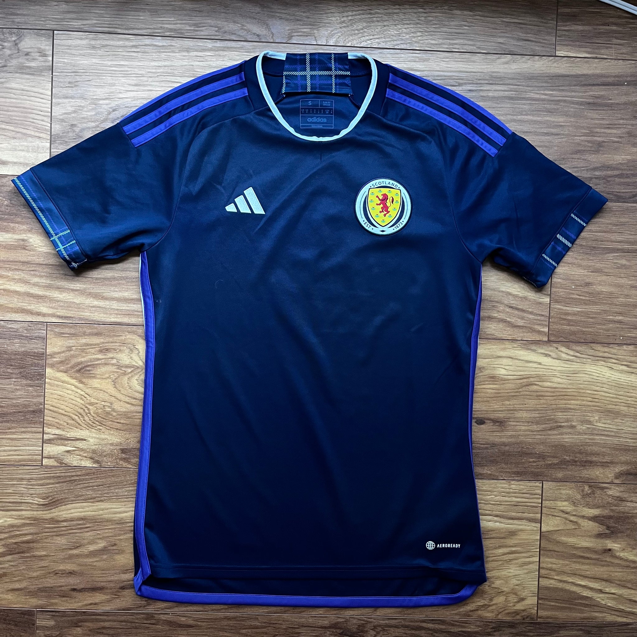 Notes - Rep your side in this men's Scotland 2022 Home Shirt from adidas. Coming in a Team Navy Blue colourway, this slim-fit shirt is cut from ultra-smooth, lightweight recycled poly fabric for essential comfort. It's built with sweat-wicking AEROREADY tech with mesh inserts to keep you cool, and features a classic crew neckline and short sleeves inspired by the pro kits. Finished up with adidas' iconic 3-Stripes and Badge of Sport logo, with a signature Scotland crest at the chest to highlight your pride. .|HC4171