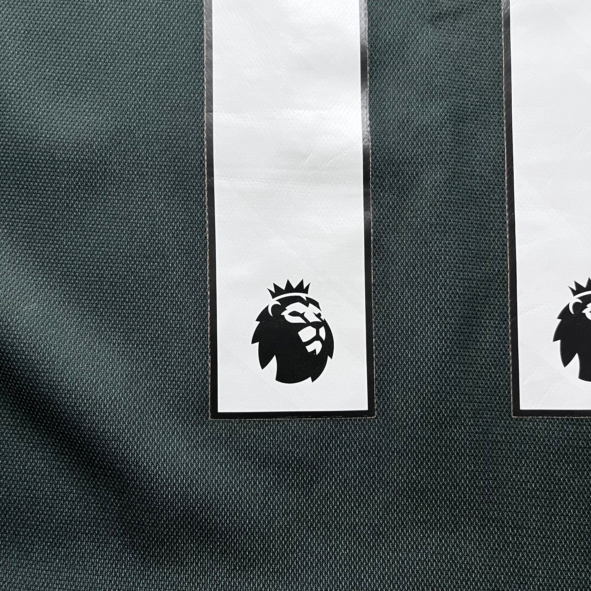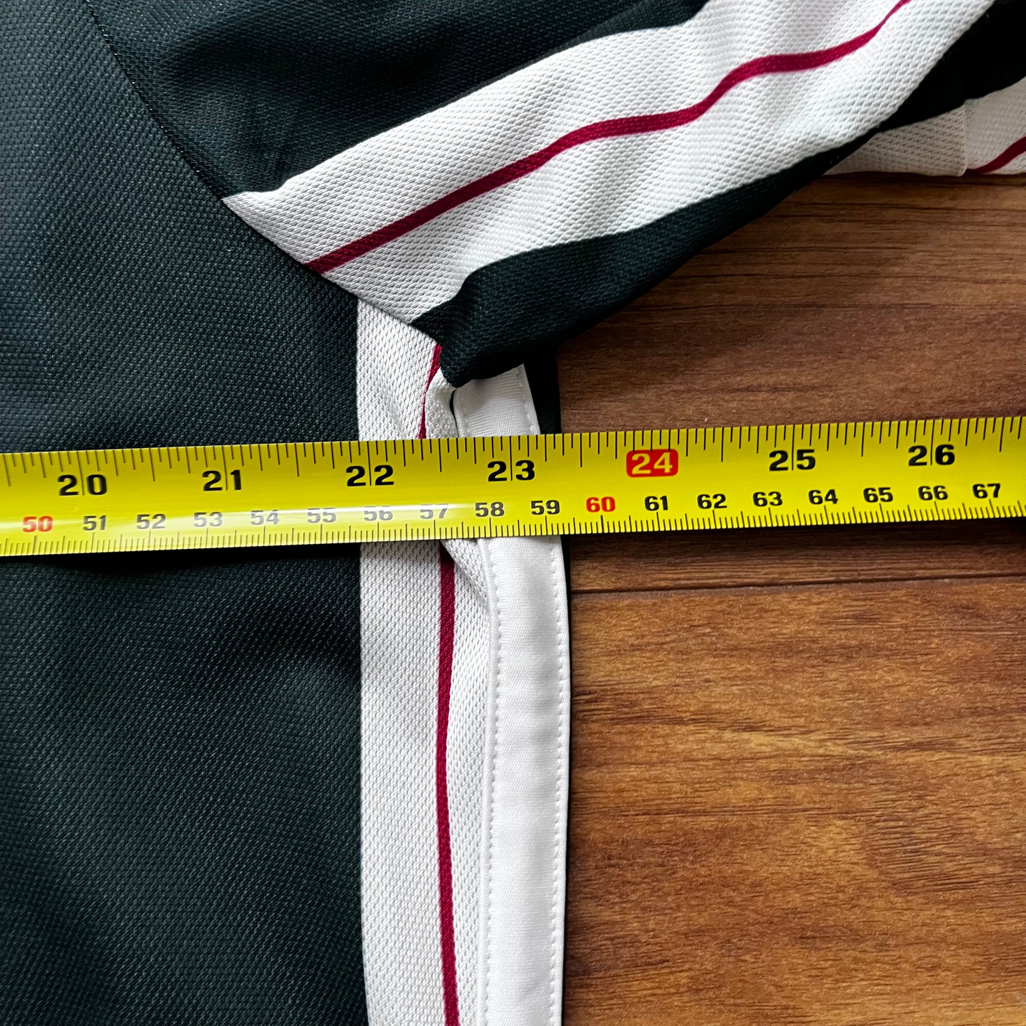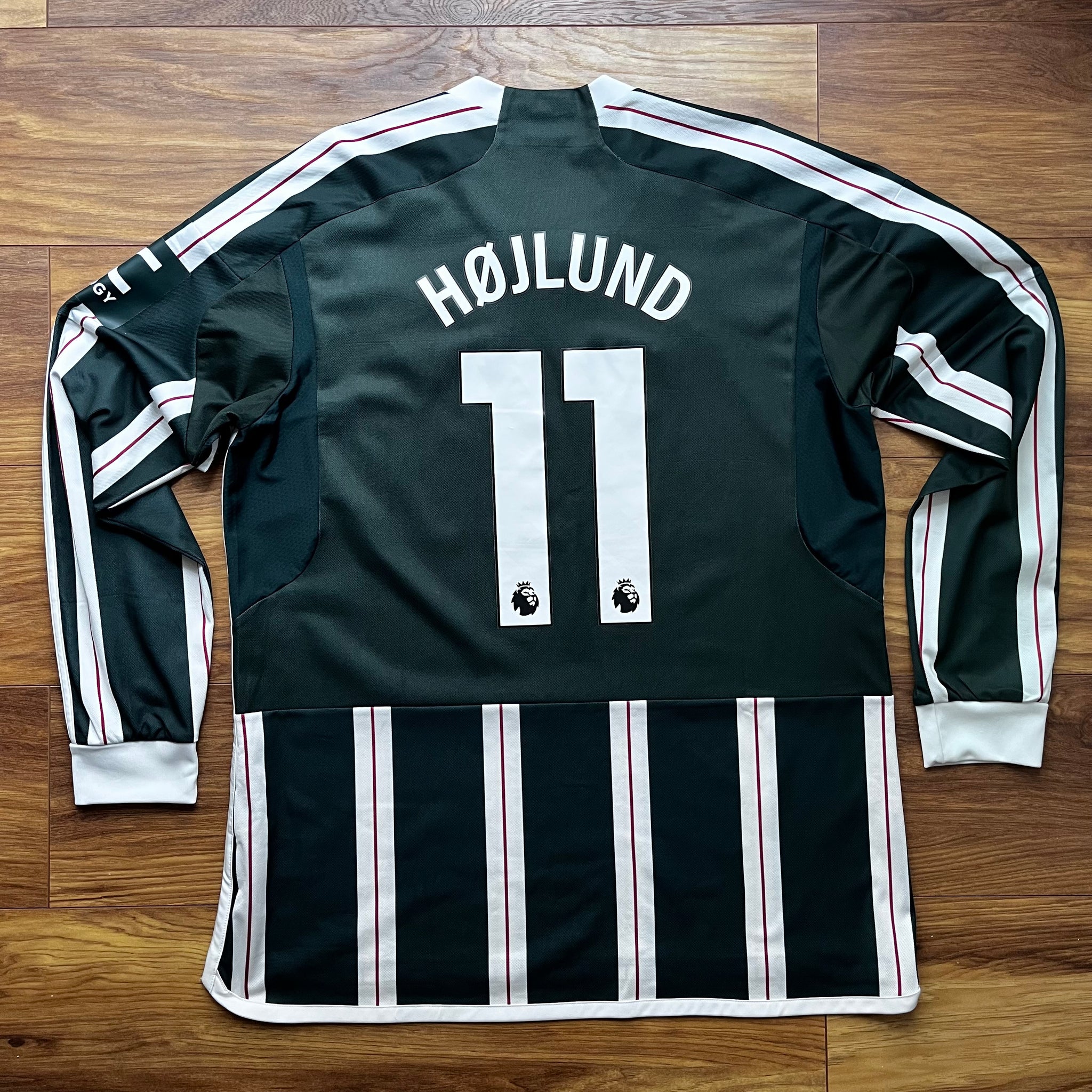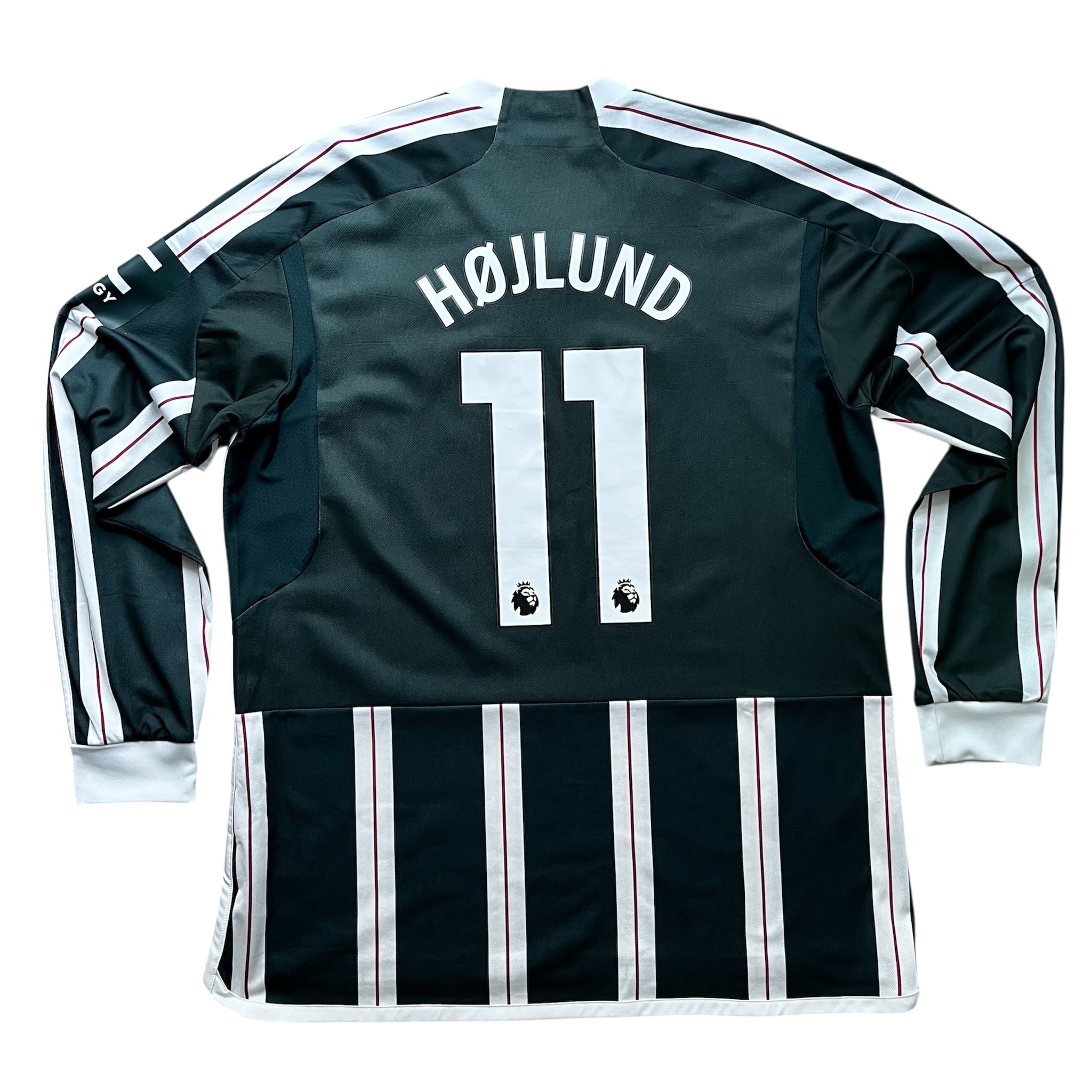 Away shirt designed for the 2023-24 season. The design is reminiscent of the vertically-striped away shirts worn in the club's early stages over 100 years ago, while the green and red colourway evokes Manchester's urban landscape and brickwork respectively