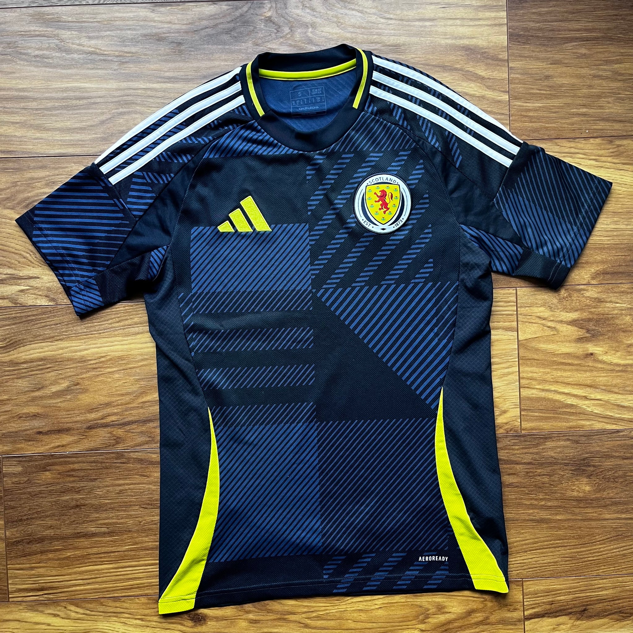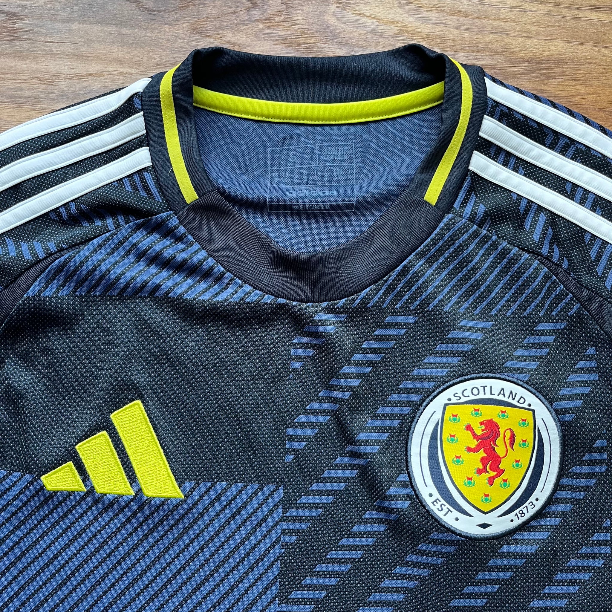 Details - Home shirt as worn when Scotland faced Germany, Switzerland, and Hungary in Group A in the 2024 Euros in Germany. Scotland faced a 5–1 defeat in the opening match against the hosts Germany, followed by a 1–1 draw with Switzerland and a narrow 1–0 loss to Hungary, resulting in a last-place finish in the group. An estimated 200,000 Scotland fans made the journey to Euro 2024.